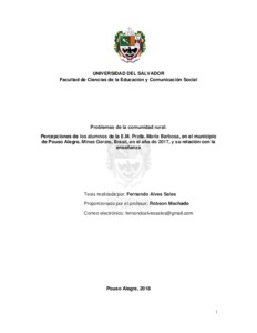 Alves Sales, Fernando (2018) Problemas de la comunidad rural : percepciones de los alumnos de la E.M. Profa. Maria Barbosa, en el municipio de Pouso Alegre, Minas Gerais, Brasil, en el año de 2017, y su relación con la enseñanza. Tesis de Maestría, Universidad del Salvador.